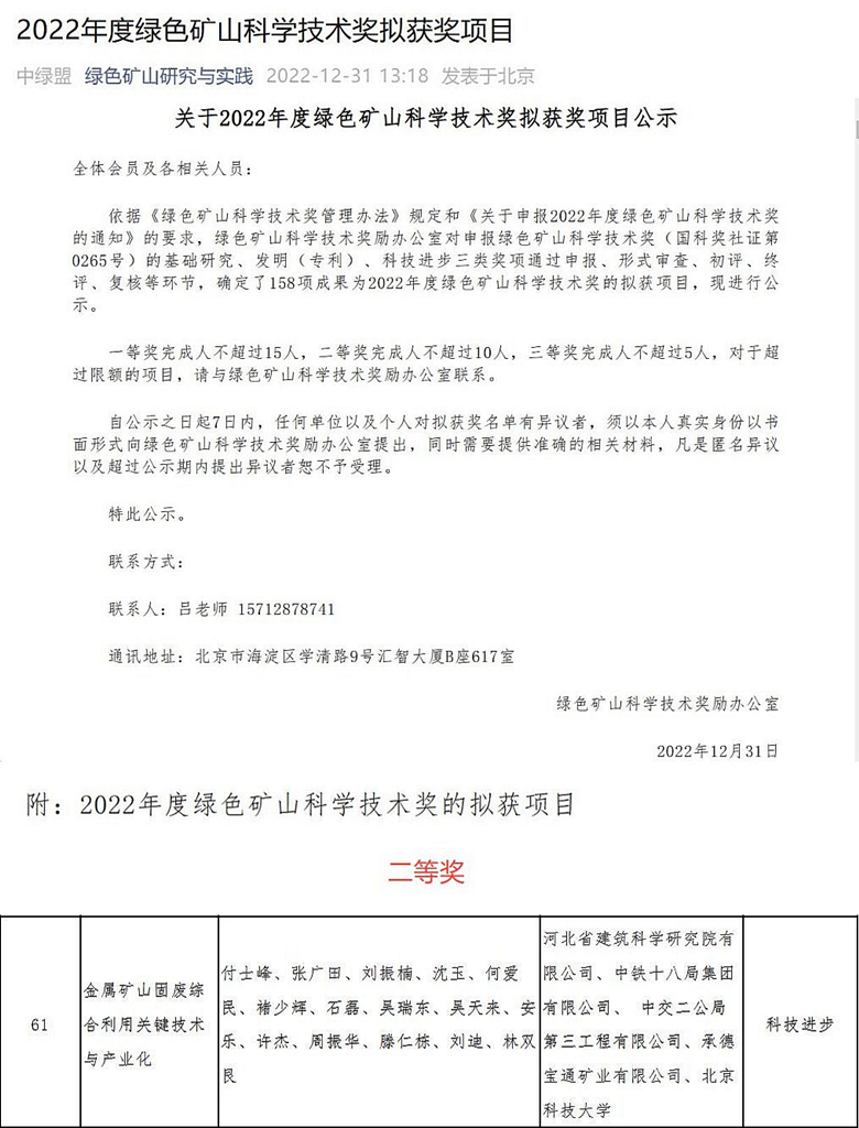 我公司申報(bào)的“金屬礦山固廢綜合利用關(guān)鍵技術(shù)與產(chǎn)業(yè)化”項(xiàng)目依據(jù)《綠色礦山科學(xué)技術(shù)獎(jiǎng)管理辦法》規(guī)定和《關(guān)于申報(bào)2022年度綠色礦山科學(xué)技術(shù)獎(jiǎng)的通知》的要求,經(jīng)綠色礦山科學(xué)技術(shù)獎(jiǎng)勵(lì)辦公室對(duì)申報(bào)綠色礦山科學(xué)技術(shù)獎(jiǎng)(國科獎(jiǎng)社證第0265號(hào))的基礎(chǔ)研究、發(fā)明(專利)、科技進(jìn)步三類獎(jiǎng)項(xiàng)通過申報(bào)、形式審查、初評(píng)、終評(píng)、復(fù)核等環(huán)節(jié),確定我公司申報(bào)的“金屬礦山固廢綜合利用關(guān)鍵技術(shù)與產(chǎn)業(yè)化”榮獲2022年度綠色礦山科學(xué)技術(shù)獎(jiǎng)二等獎(jiǎng)。