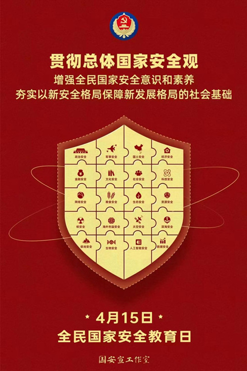 2023年4月15日是第八個全民國家安全教育日?;顒又黝}為:“貫徹總體國家安全觀,增強全民國家安全意識和素養(yǎng),夯實以新安全格局保障新發(fā)展格局的社會基礎(chǔ)?!?/span>